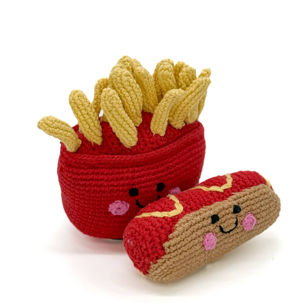 Bring joy to little ones with the Handmade Fairtrade Crochet French Fries Rattle! This cute, eco-conscious toy is carefully made by talented artisans from sustainable fibers. Shaped like a tasty pack of French fries, it offers soft, cuddly textures and a gentle rattle, ideal for sensory exploration and creative playtime.