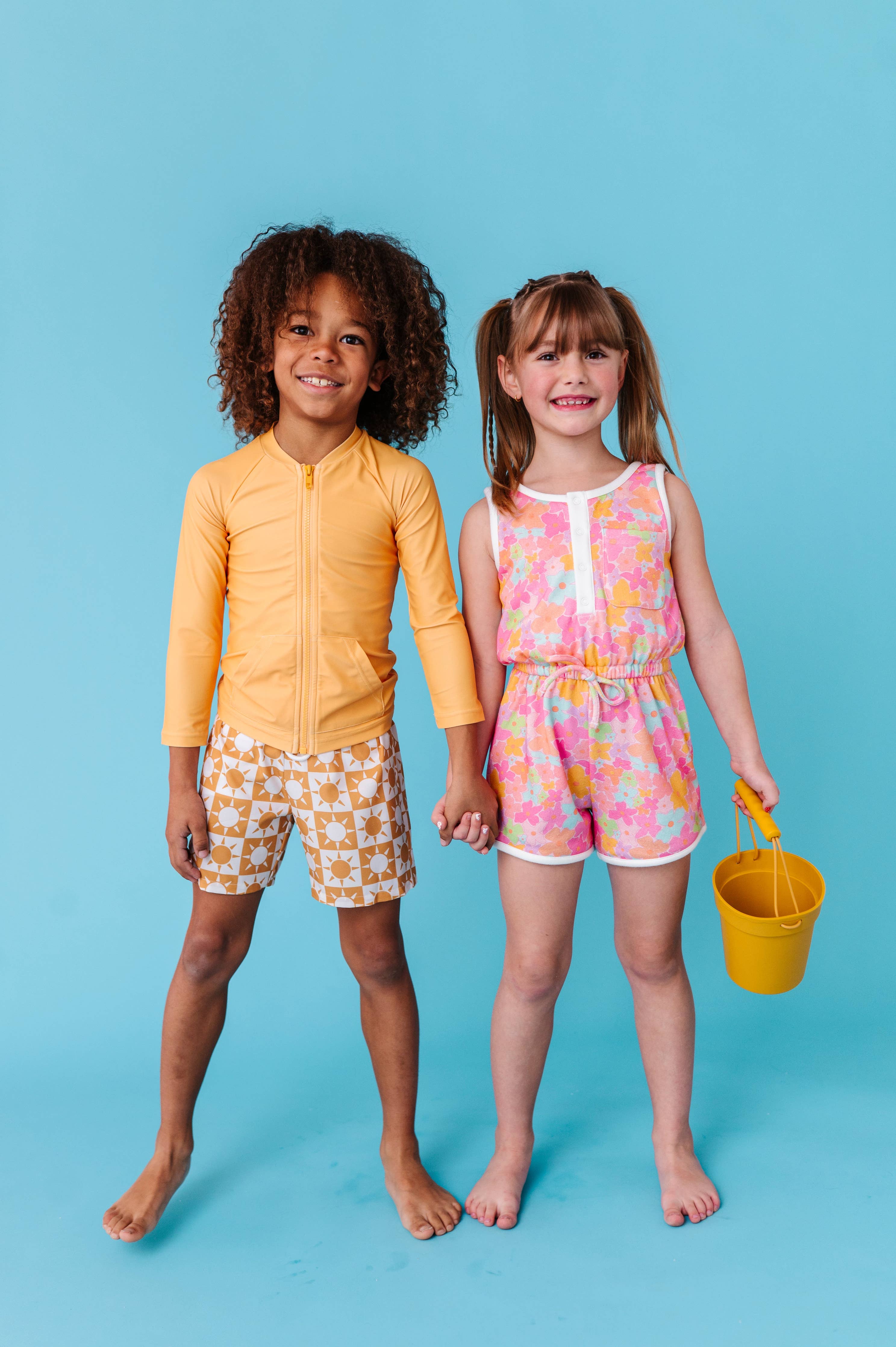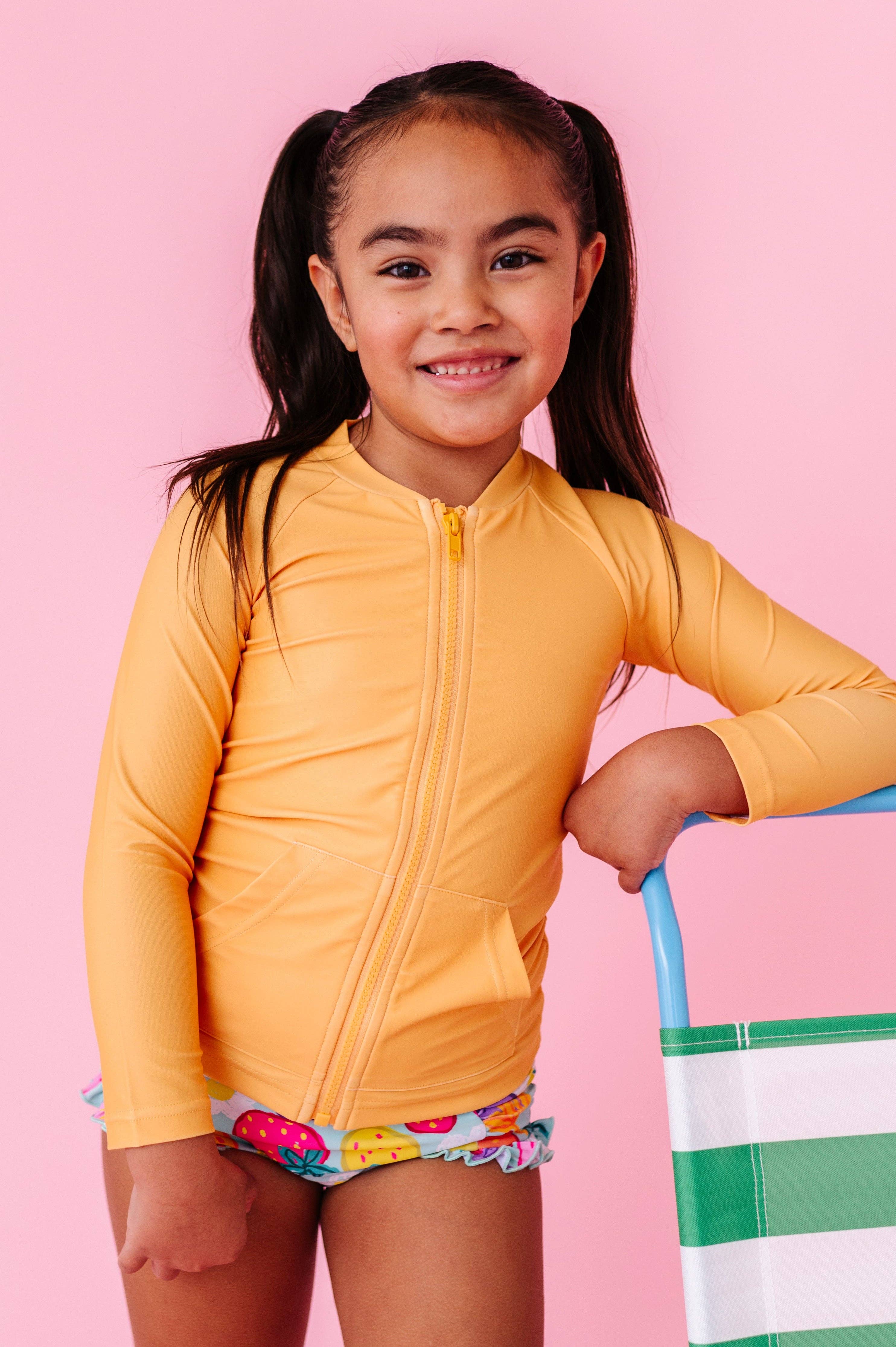 Make a splash in this vibrant orange citrus zip rash shirt from Made by Molly. Crafted from stretchy, digitally printed spandex swim fabric, it delivers comfort and style for water adventures. The bold orange hue turns heads whether you're at the beach or pool. Easy care keeps it looking fresh—just wash inside out in a laundry bag with cold water and gentle cycle, then lay flat to dry. Perfect for active kids who want protection and personality in one rad package.