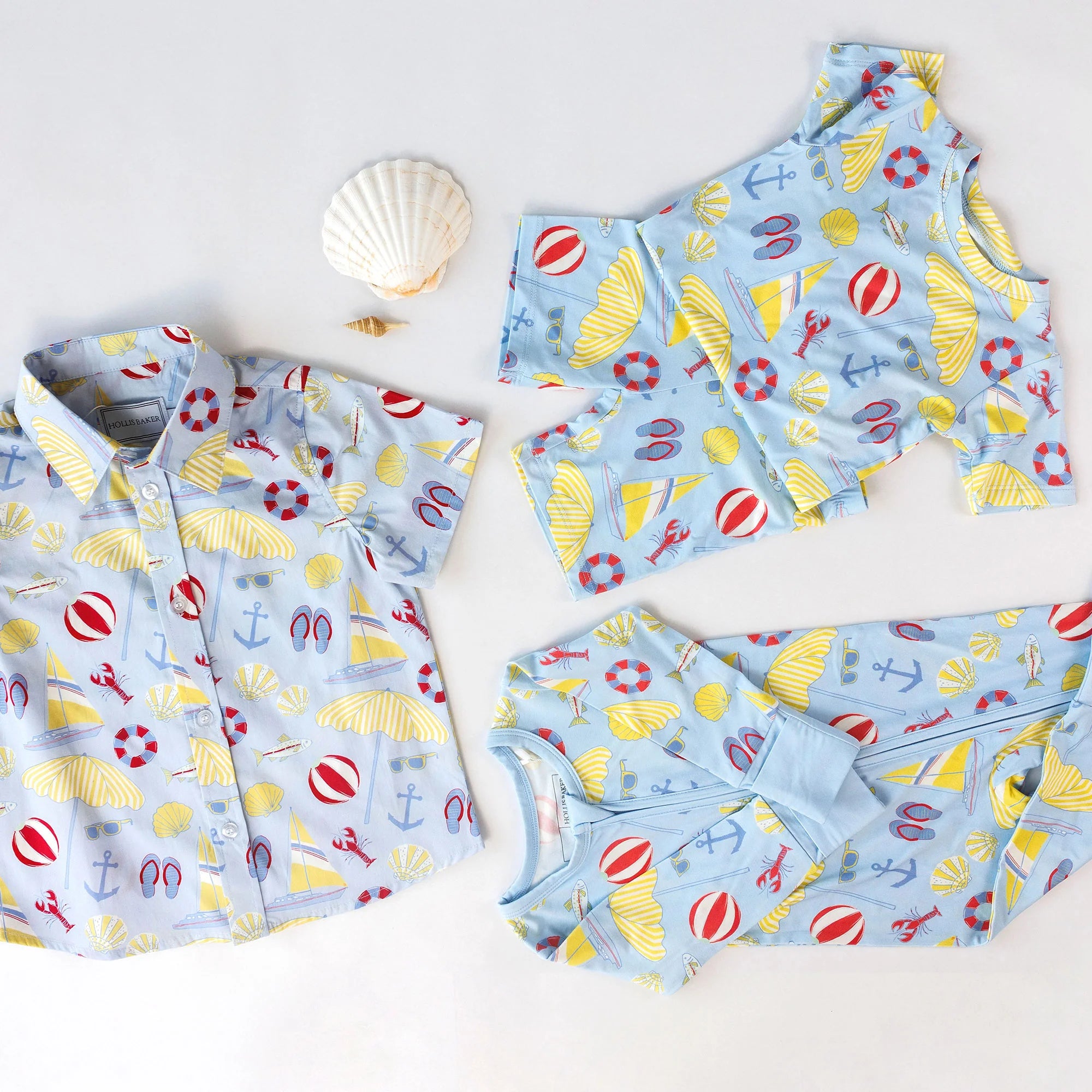 Made for slow mornings and sweet summer nights, the Short Loungewear Set in Beach Days Blue is crafted from the same buttery-soft bamboo blend as our beloved zipper rompers. Lightweight, breathable, and perfectly stretchy, this two-piece set keeps little ones comfortable from bedtime to breakfast. Featuring a relaxed short-sleeve top and coordinating elastic-waist shorts, it's an easy favorite for warm-weather lounging. Perfect for matching sibling moments! 95% viscose from bamboo, 5% spandex For best results, machine wash cold on gentle cycle; hang to dry. Do not iron.