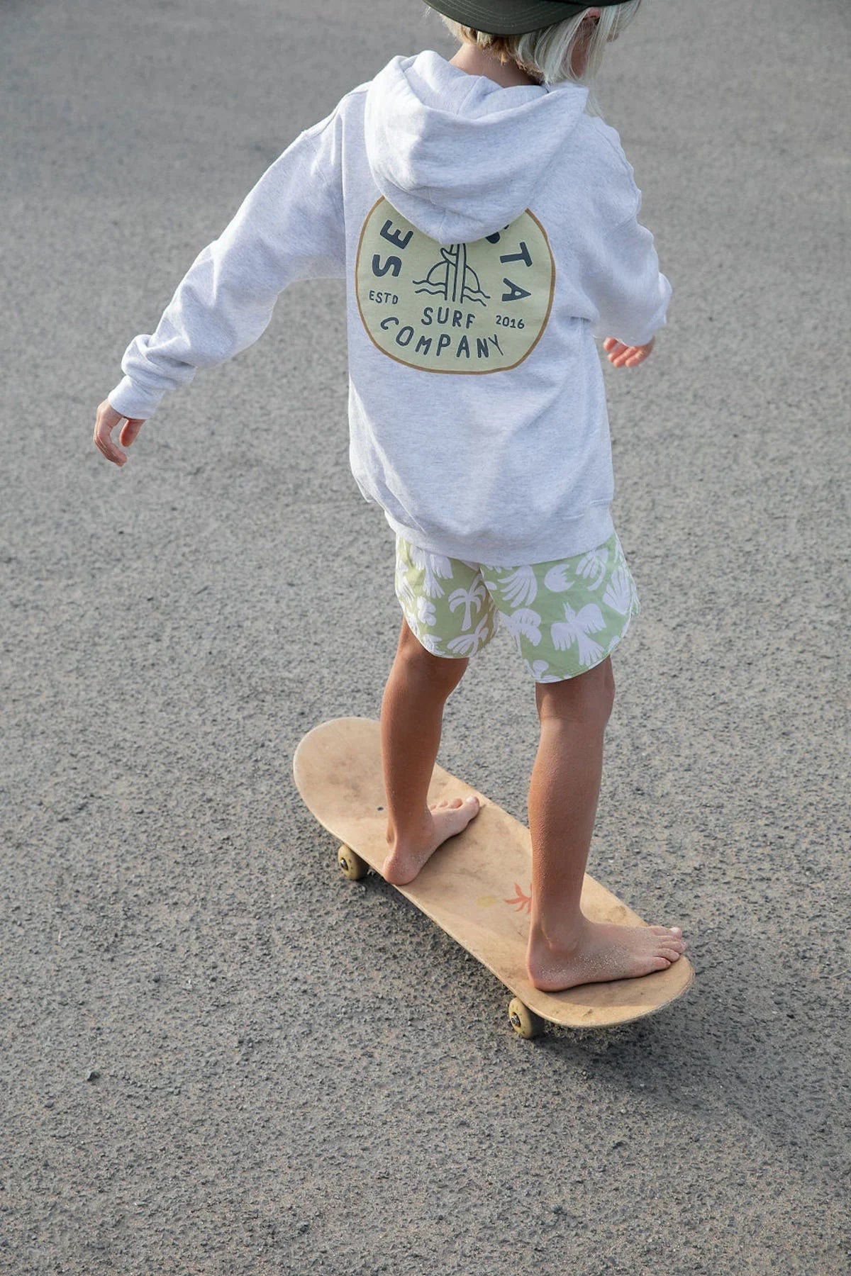 Rock the Seaesta Surf Co vibe year-round in this mid-weight heather grey hoodie. Crafted from an eco-conscious cotton and polyester blend, it delivers that super soft feel kids love while keeping sustainability in mind. Built to last through beach days, bonfires, and everything in between.