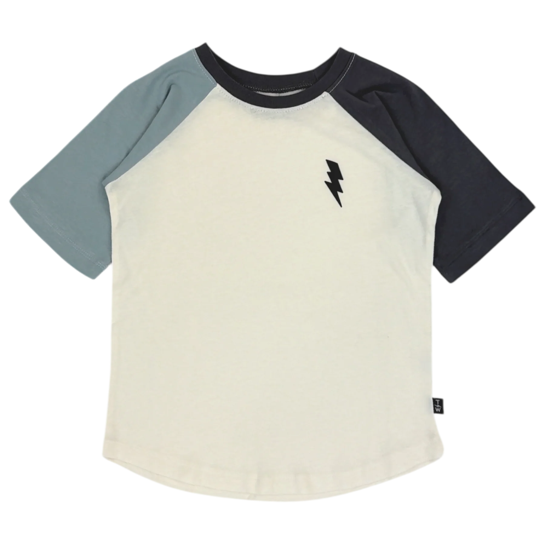 Boys Color Block Tee This Tiny Whales raglan tee features a striking blue and black bolt design that captures effortless cool. Crafted from soft 100% cotton jersey, it's comfortable enough for everyday wear and durable through countless washes. The preshrunk fabric resists shrinking, while the non-toxic water-based ink keeps colors vibrant. Machine washable for easy care, this versatile tee pairs perfectly with jeans, shorts, or joggers for a look that works from playground to weekend adventures.