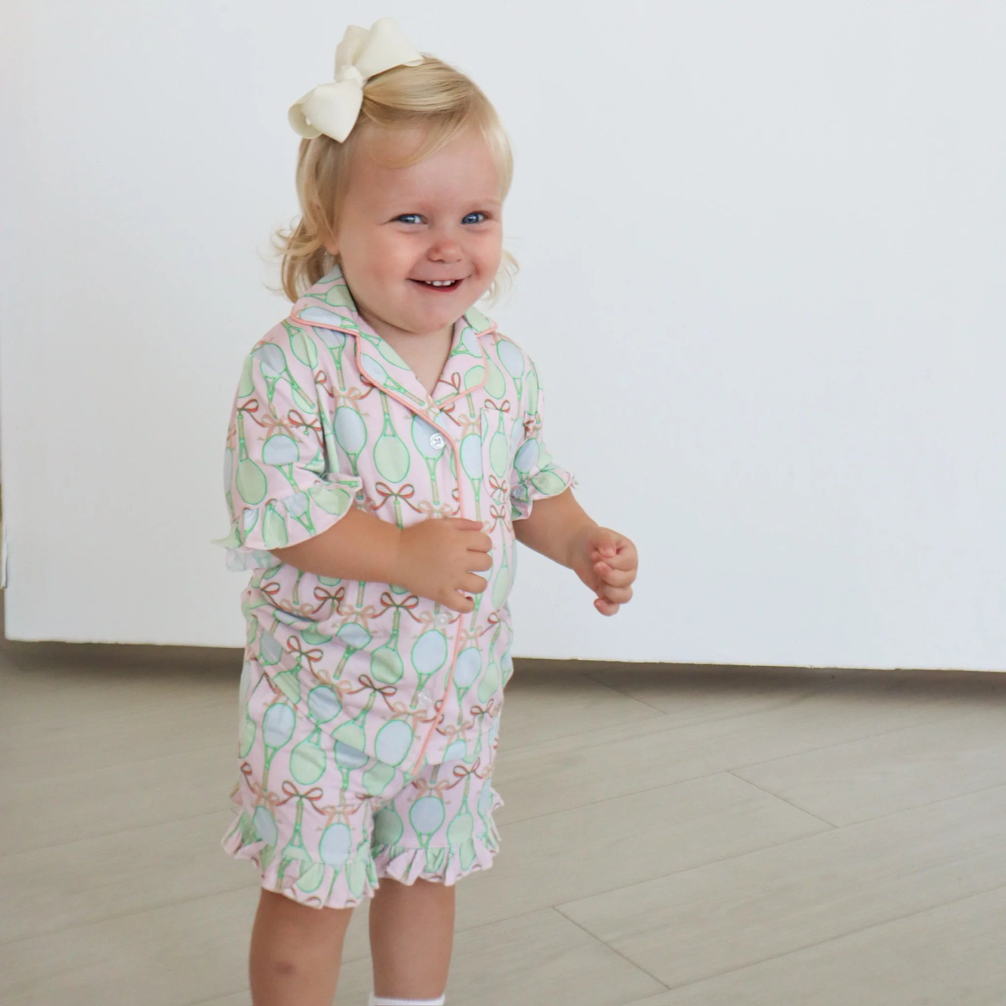 A charming set designed for effortless comfort and playtime. The Ruffle Set showcases our Tennis print in a luxurious blend of 95% viscose and 5% bamboo, offering softness you'll love. Delicate piping frames the collar while ruffled details on the sleeves and shorts add playful flair. Practical pockets keep essentials close. Pair it with our coordinating Zipper Romper to match with little sis.