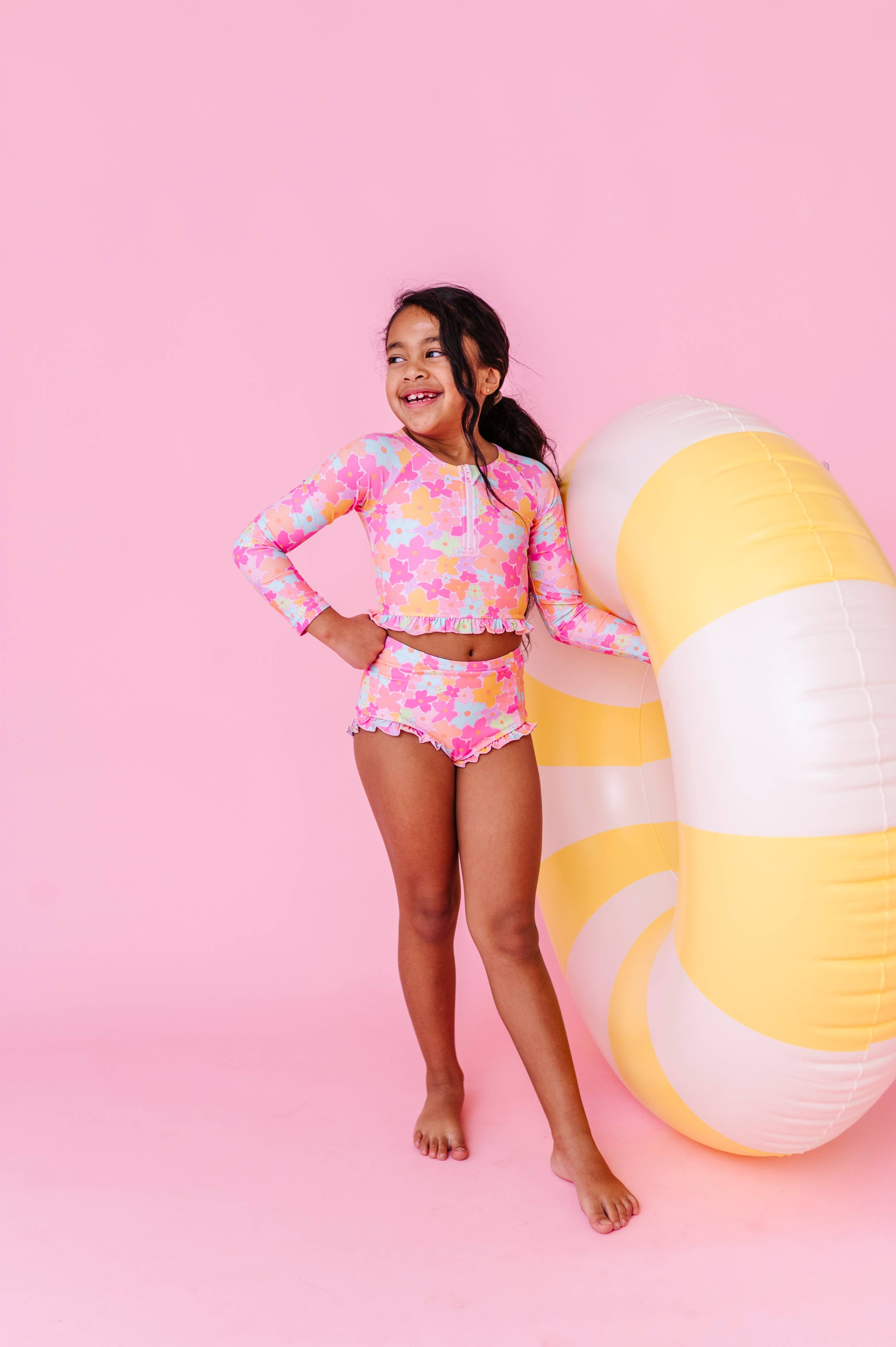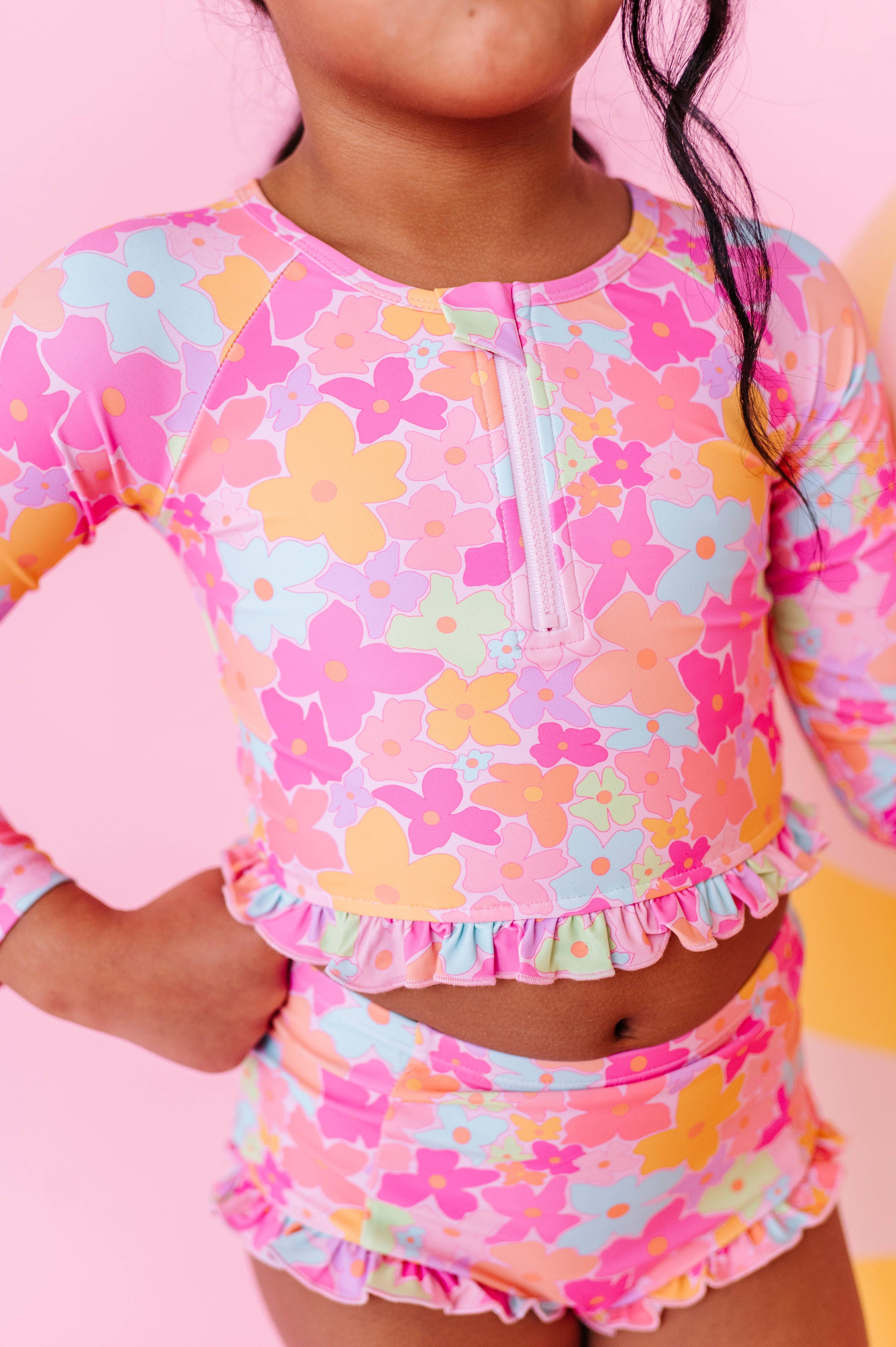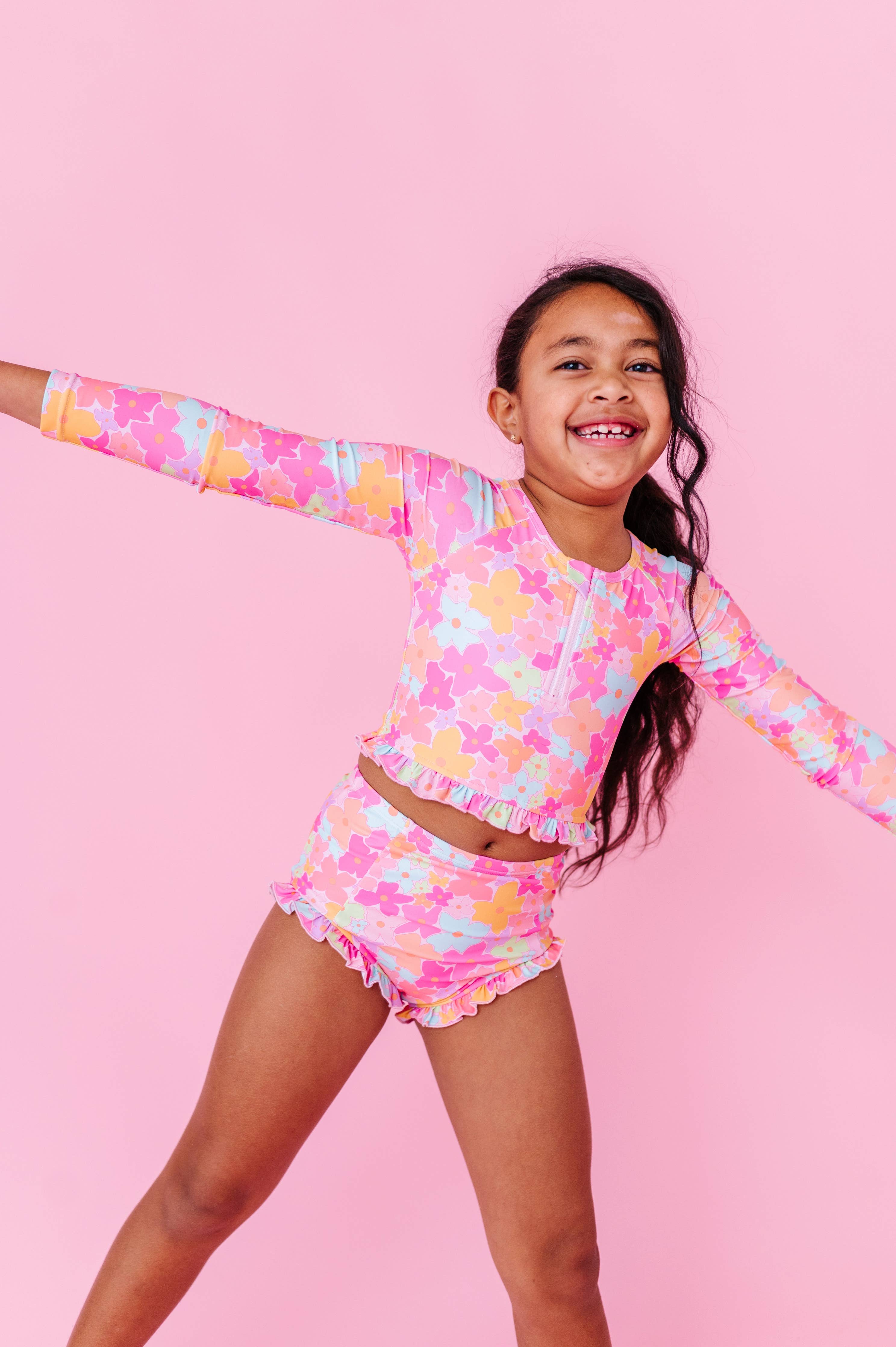 Made by Molly Tutti Fruitti Blossom 1/4 Zip Rashguard 2-Piece Dive into style with this adorable two-piece rashguard set featuring a vibrant blossom print and charming ruffled seams. The matching top and bottom offer sun protection and comfort for water play, beach days, or pool time. RAD Details + Digitally printed, stretchy spandex swim fabric + Cute ruffle detailing on seams for extra charm + 1/4 zip top for easy on and off + Wash inside out in a laundry bag and without zippers, velcro, or anything that could snag + Cold water, gentle cycle, non-phosphorus detergent + Lay flat or hang to dry Perfect for little adventurers who love making a splash in style.