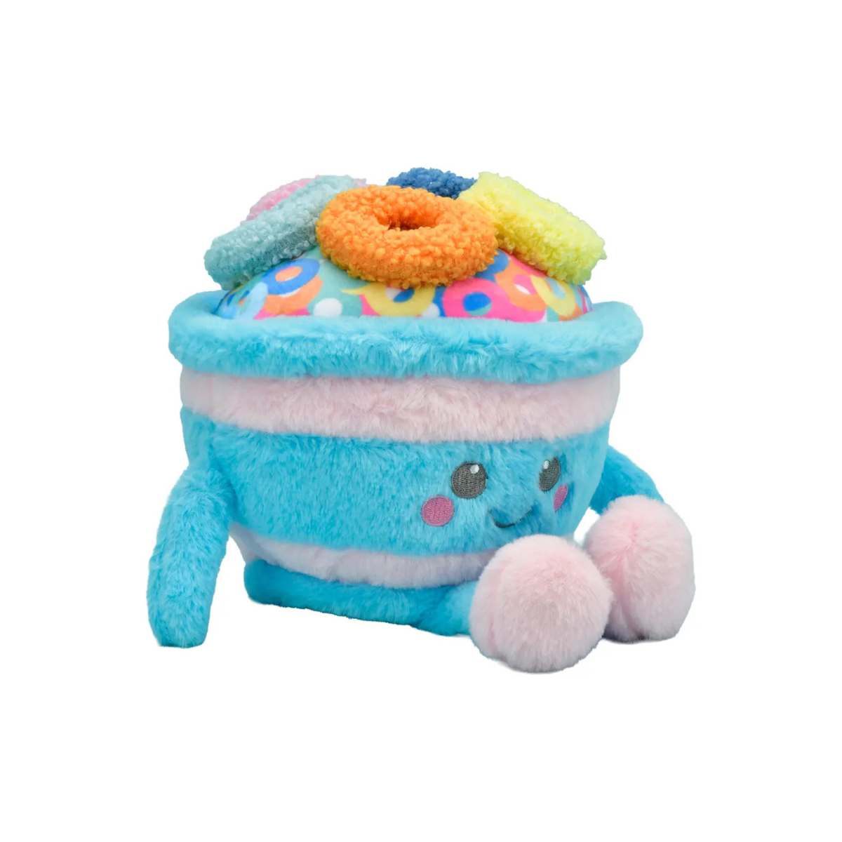 Adorable cereal-themed plush featuring a blue bow and colorful Froot Loops design. Crafted from soft furry and fleece materials with embroidered details for extra charm. Made from 100% polyester with polyfiber fill for cuddly comfort. Perfect for collectors and plush enthusiasts. Measures 6" to 8" tall—the ideal size for display or snuggling.