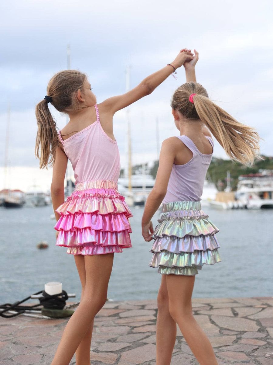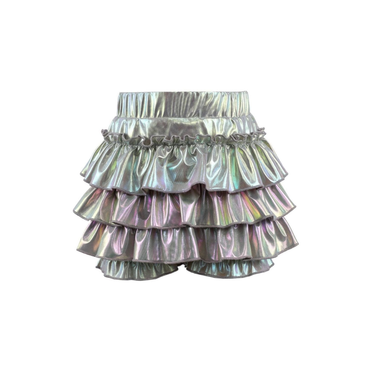 Dazzle in this eye-catching holographic ruffle skort, crafted with layered shimmering fabric that sparkles from every angle. The stretchy elastic waistband ensures comfortable all-day wear, while the built-in shorts provide coverage and freedom to move. Its iridescent finish catches light beautifully, making it the perfect choice for celebrations and special moments. Made from a premium polyester and spandex blend with a stunning holographic finish.