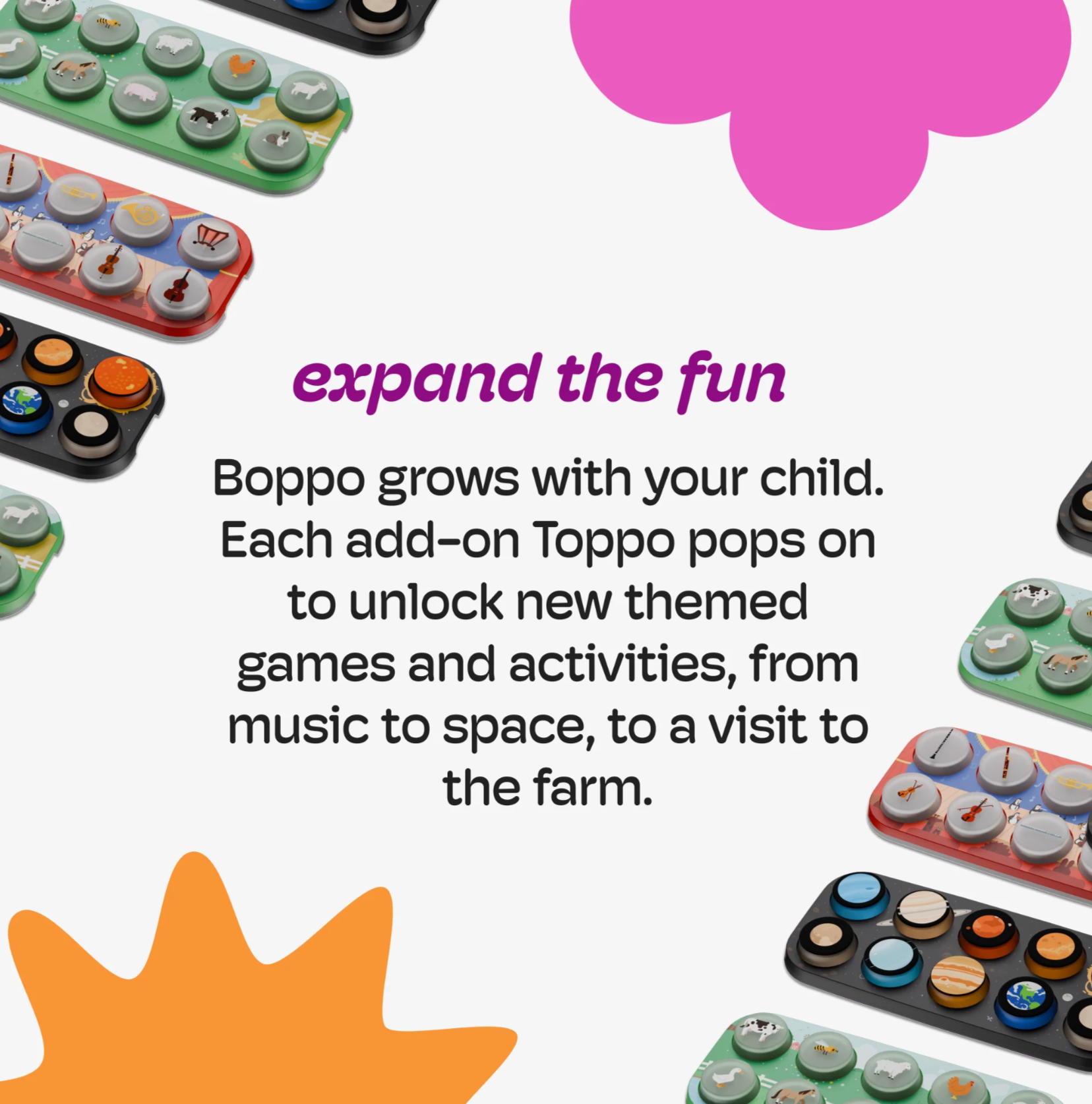 Boppo is better with Toppos. Snap this Toppo onto your Boppo and step into the conductor's shoes, guiding a full orchestra of instruments—violin, flute, cello, horns, and beyond—while discovering the magic of classical music. Build essential music foundations through playful exploration with the At the Symphony Toppo. Dive into orchestral instrument families, their unique sounds, and how they work together through engaging facts, stories, and listening experiences. Ten interactive activities—from Sandbox Symphony where you compose your own pieces, to Rhythm Rehearsal and Symphony Snap—strengthen early music literacy by developing rhythm awareness, tempo recognition, pattern skills, and listening abilities. Every activity guides children with clear directions and age-appropriate challenges, fostering both musical confidence and focused learning.