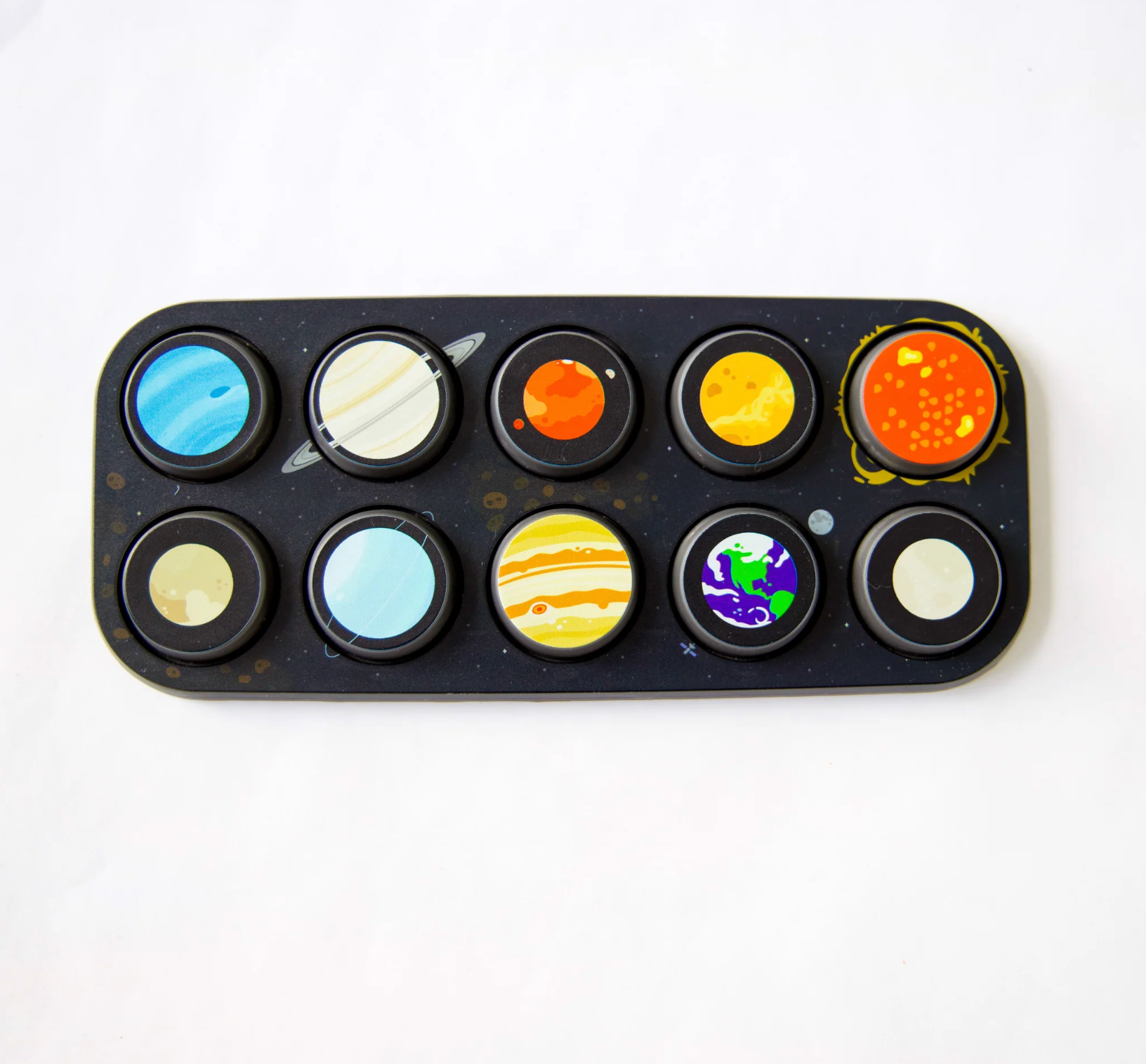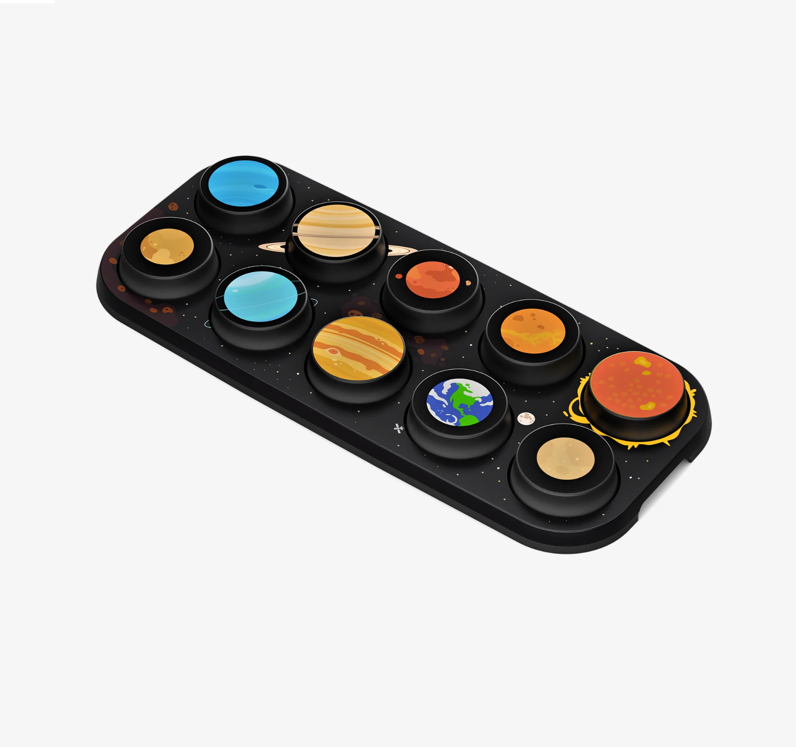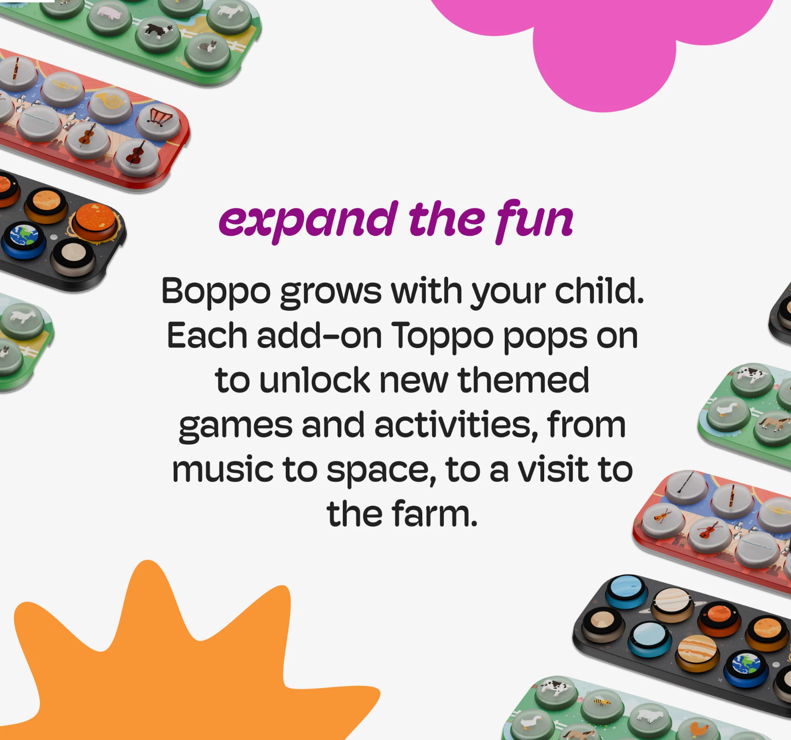 Boppo gets even better with Toppos. Spark your child's curiosity about space with this Solar System Toppo. Simply pop it onto your Boppo and unlock ten screen-free adventures across the cosmos. From Mercury's blazing heat to Neptune's icy winds, kids explore essential STEM concepts including gravity, orbits, temperature, and planetary characteristics. Every button triggers activities designed to build science literacy, develop observational abilities, expand vocabulary, and foster critical thinking through interactive games, guided quests, and cosmic challenges.