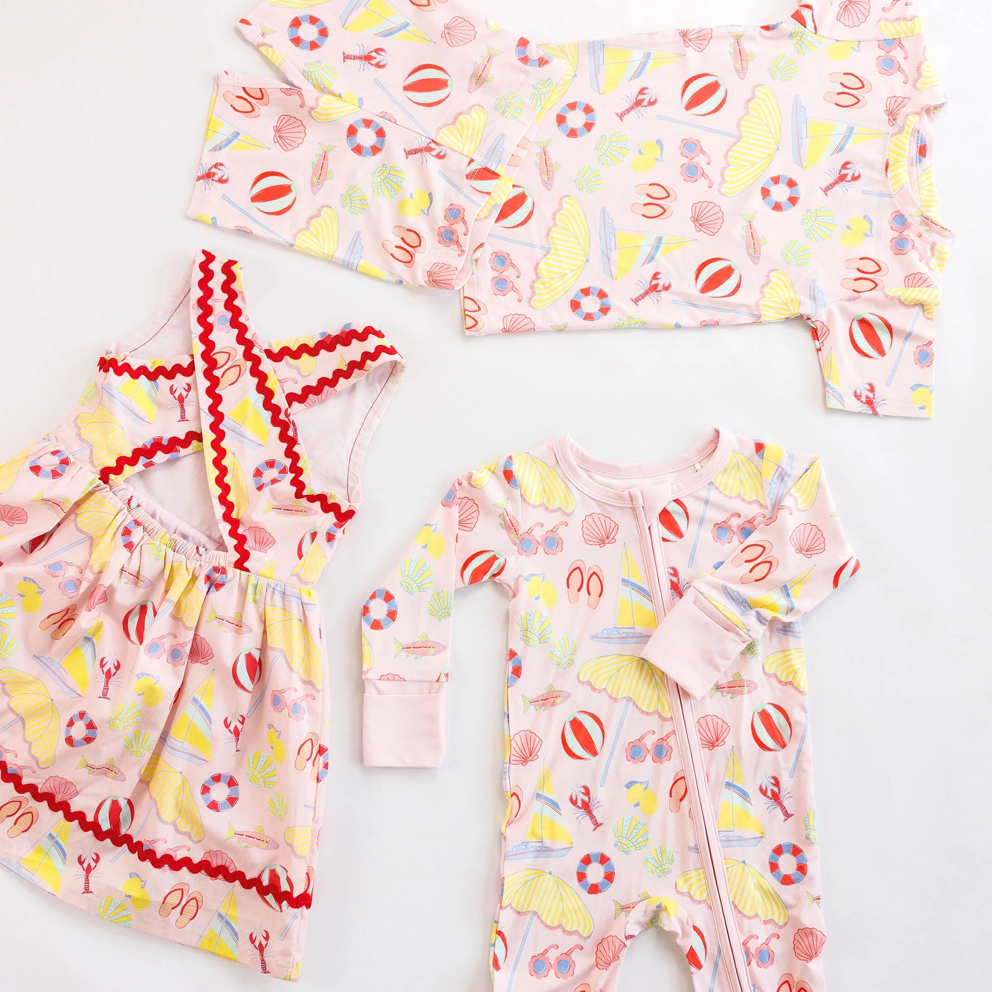 Made for slow mornings and sweet summer nights, the Short Loungewear Set in Pink Beach Days is crafted from the same buttery-soft bamboo blend as our beloved zipper rompers. Lightweight, breathable, and perfectly stretchy, this two-piece set keeps little ones comfortable from bedtime to breakfast. Featuring a relaxed short-sleeve top and coordinating elastic-waist shorts, it's an easy favorite for warm-weather lounging. Perfect for matching sibling moments! 95% viscose from bamboo, 5% spandex For best results, machine wash cold on gentle cycle; hang to dry. Do not iron.