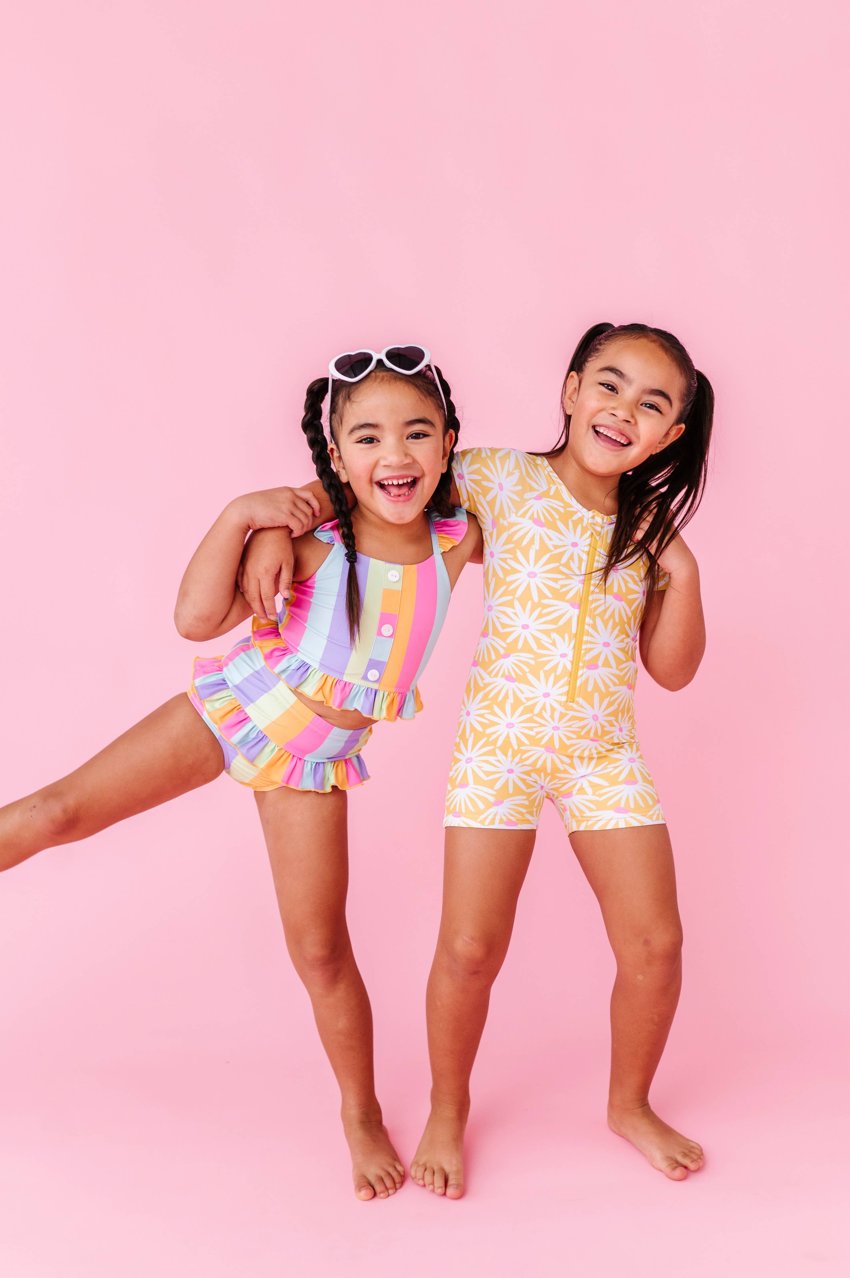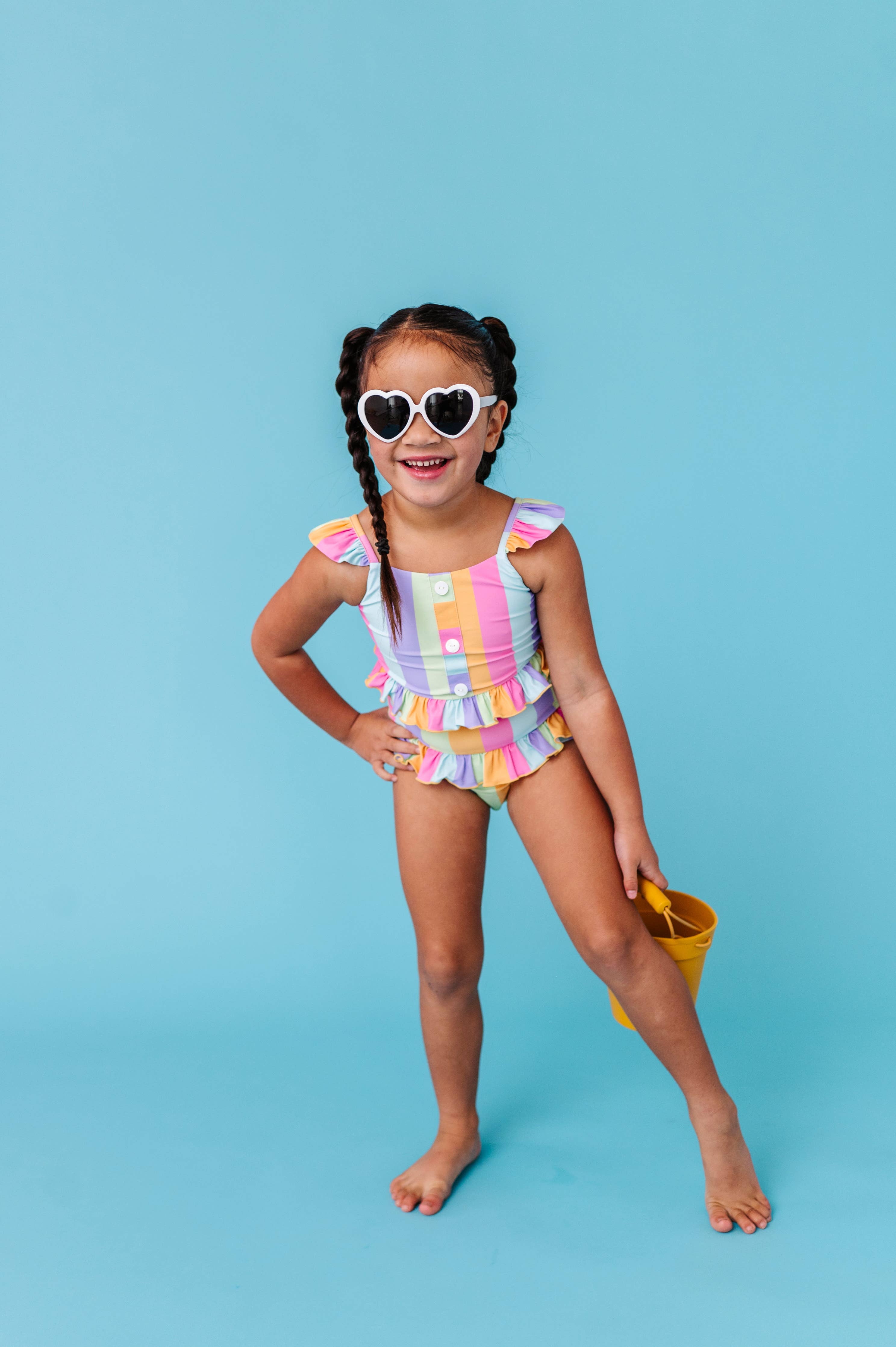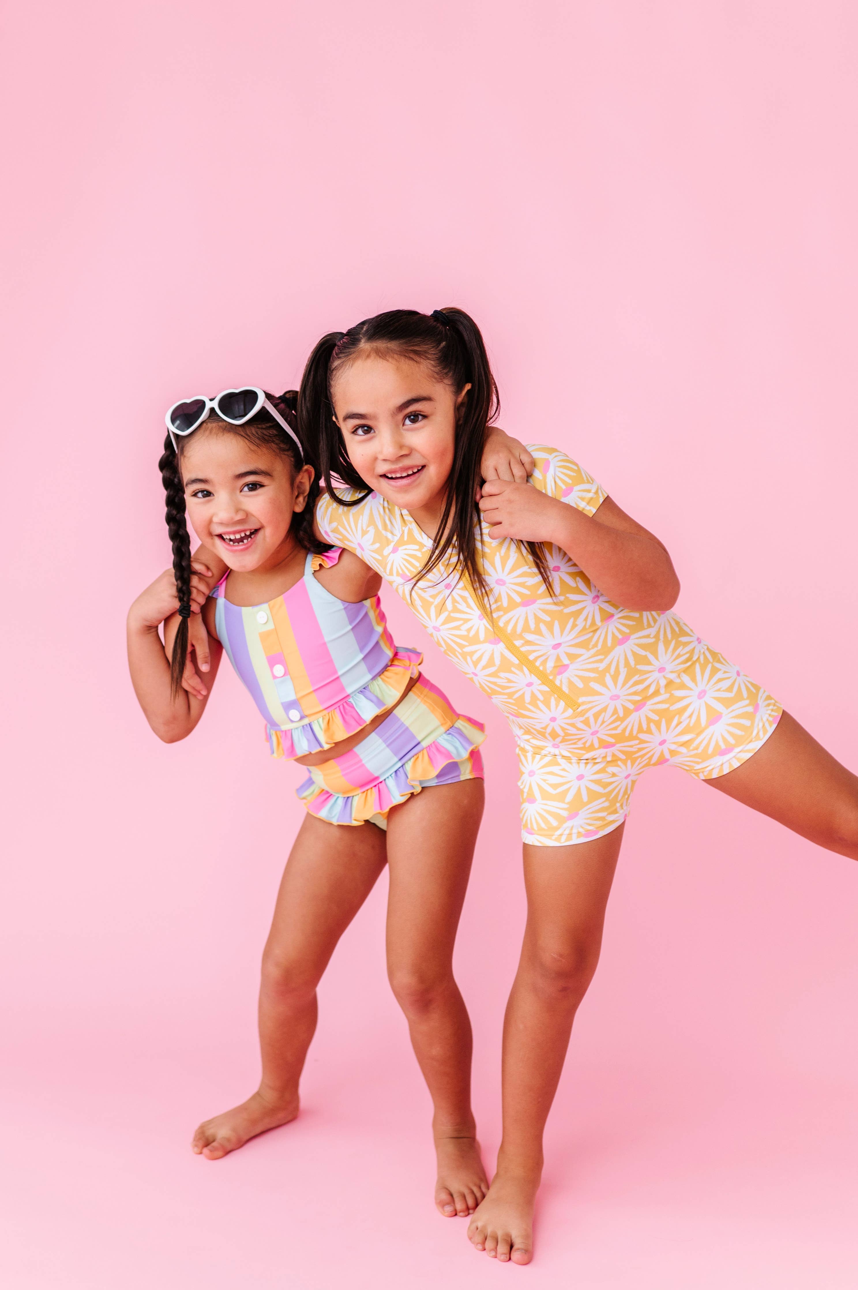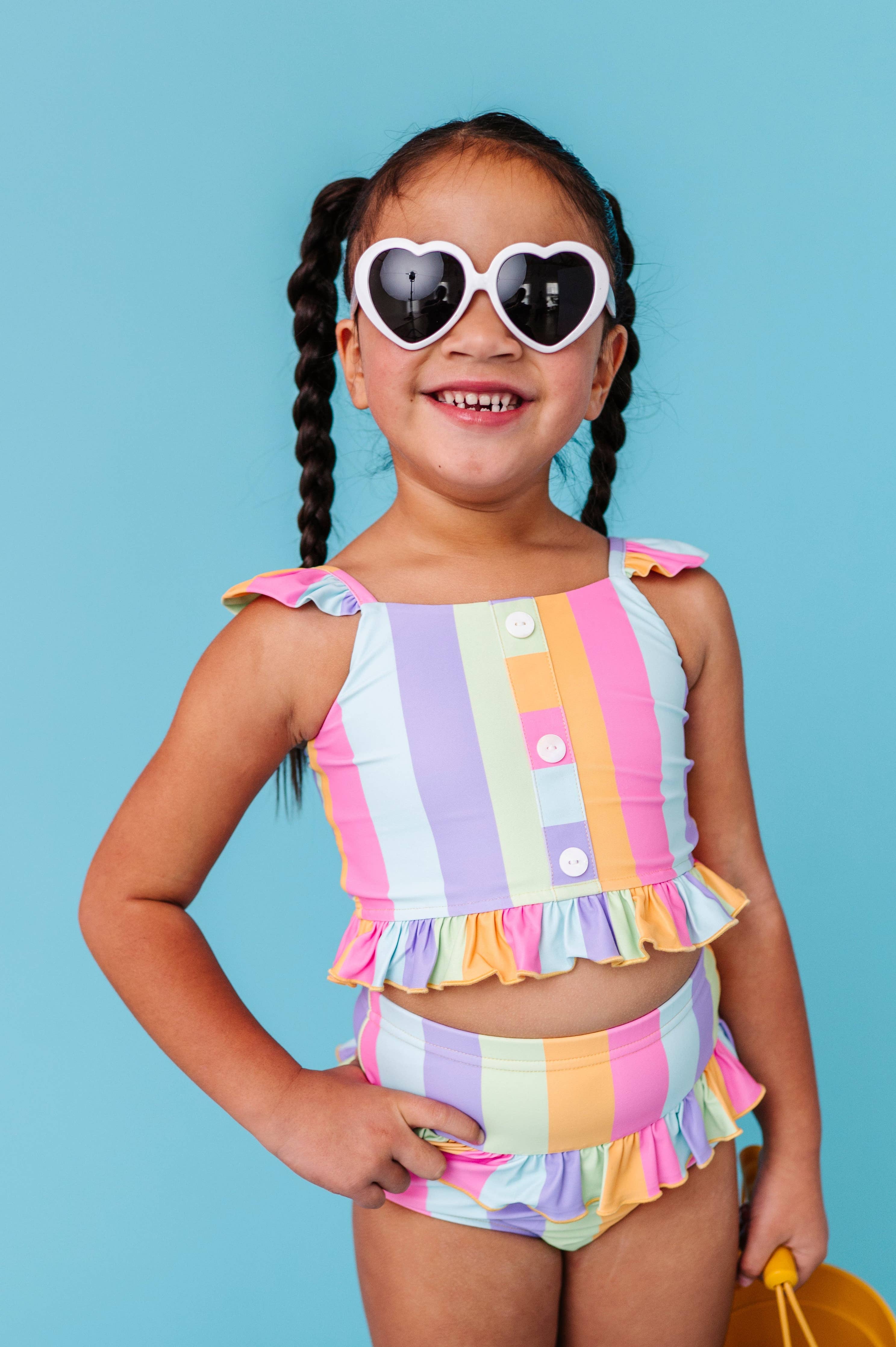 Rainbow stripe two-piece set featuring vibrant sherbert-inspired colors in a playful striped pattern. The top showcases button-front detailing with charming ruffle accents, while the coordinating bottoms complete the look. Crafted from digitally printed, stretchy spandex swim fabric for comfort and durability. Care: Wash inside out in a laundry bag using cold water on a gentle cycle with non-phosphorus detergent. Avoid washing with zippers, velcro, or anything that could snag the fabric. Lay flat or hang to dry for best results.