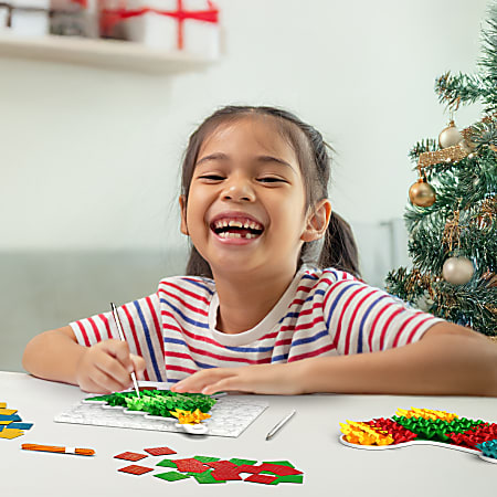 + Designed to spark creativity as kids create their own unique holiday decorations using fabric squares and Christmas-themed foam shapes like a tree and stocking.