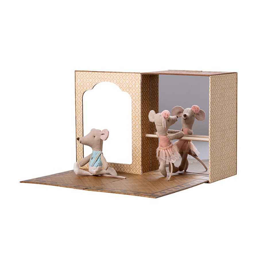 Little sister mouse is ready for her big debut! This charming ballet studio playset features a transformable design that opens to reveal a mirrored dance space complete with a magnetic barre. Two adorable ballet mice come dressed and ready to perform. Perfect for imaginative play and storytelling adventures.