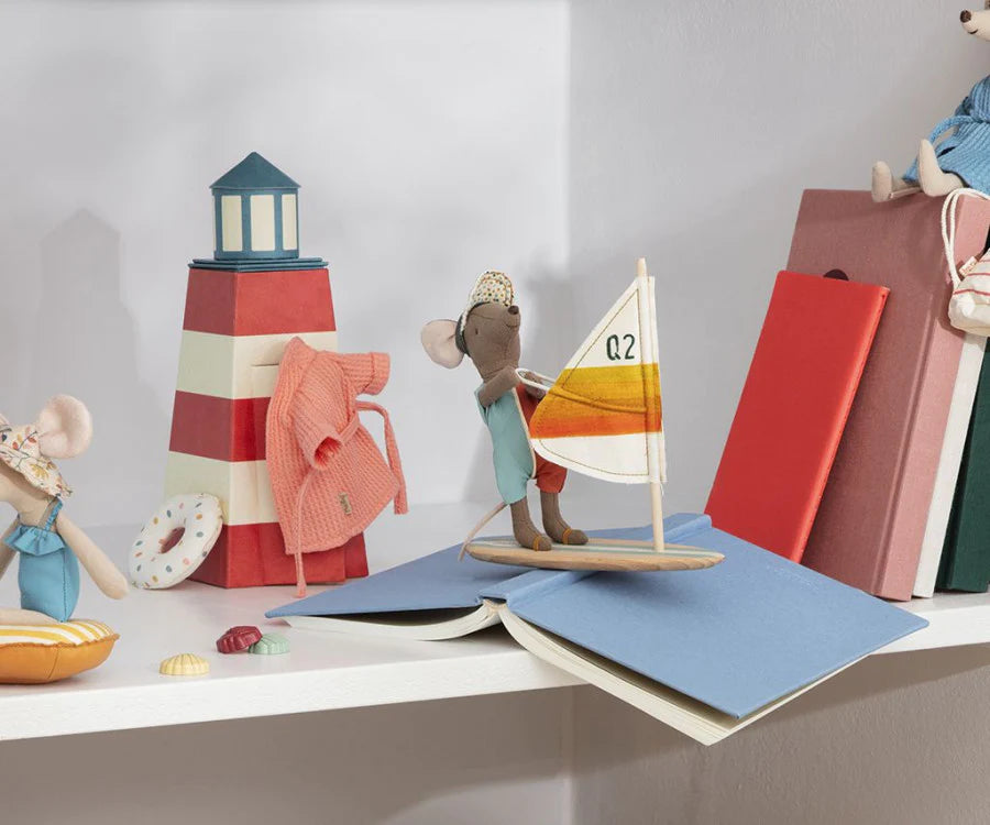 Surfer Big Brother guides his little surfer siblings with style! Wearing a cozy dusty red and aqua wetsuit and a speckled visor, he stays warm and can see clearly. His wooden surfboard, striped in mint blue and white with a colorful ‘Q2’ sail, has elastic straps to hold his feet. Plus, his magnetic hands help him steer the sail wherever he wants. Ready to ride the waves and have fun!