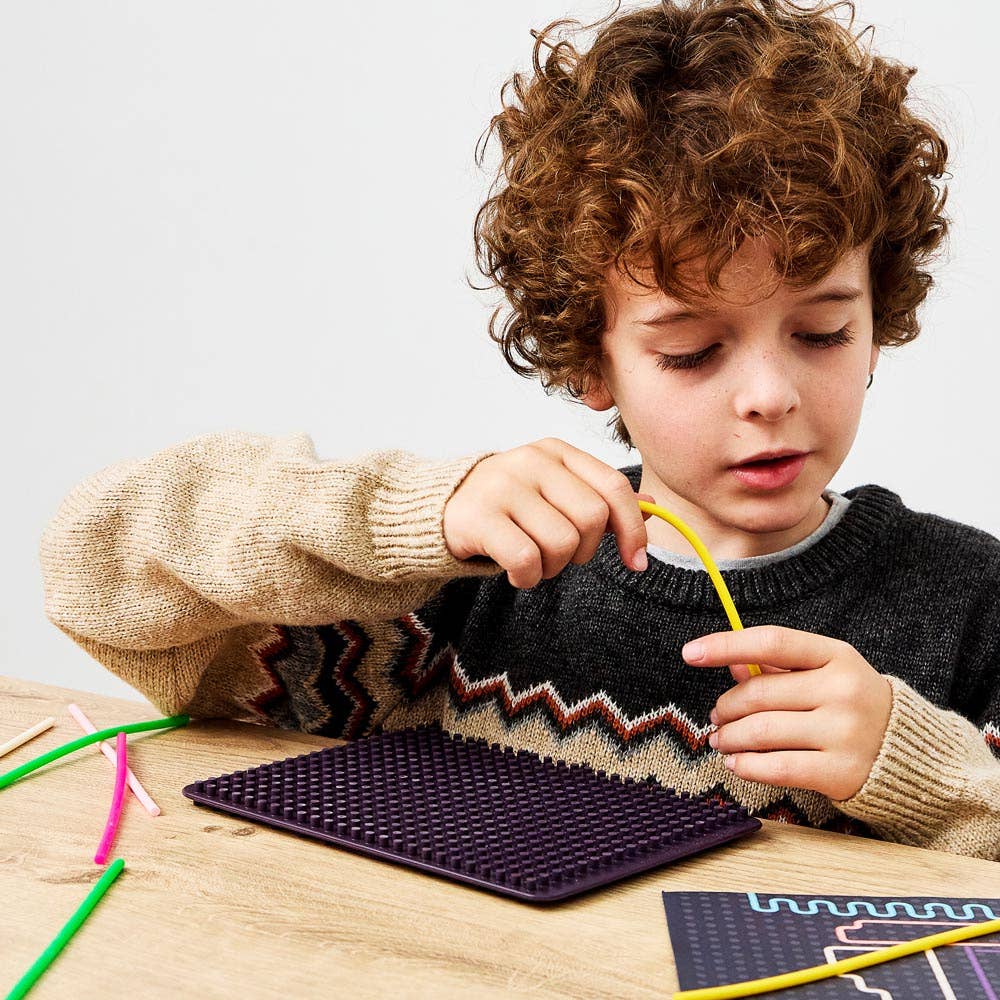Soft silicone sensory tablet with colorful noodles for tactile play and fine motor development. Features a textured square surface where noodles insert in multiple directions to spark creativity and focus. Washable and durable. Perfect for ages 18 months and up—ideal for home or on-the-go quiet time.