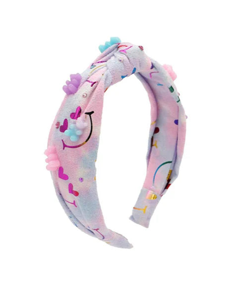 Add a splash of fun to your look with the Bari Lynn Smile Knot Headband. Featuring cheerful smiley faces and playful gummy bear accents, this headband brings a whimsical touch to any outfit. Its soft fabric and easy knot design ensure a comfortable fit all day long. Perfect for brightening your style with a joyful, youthful vibe.
