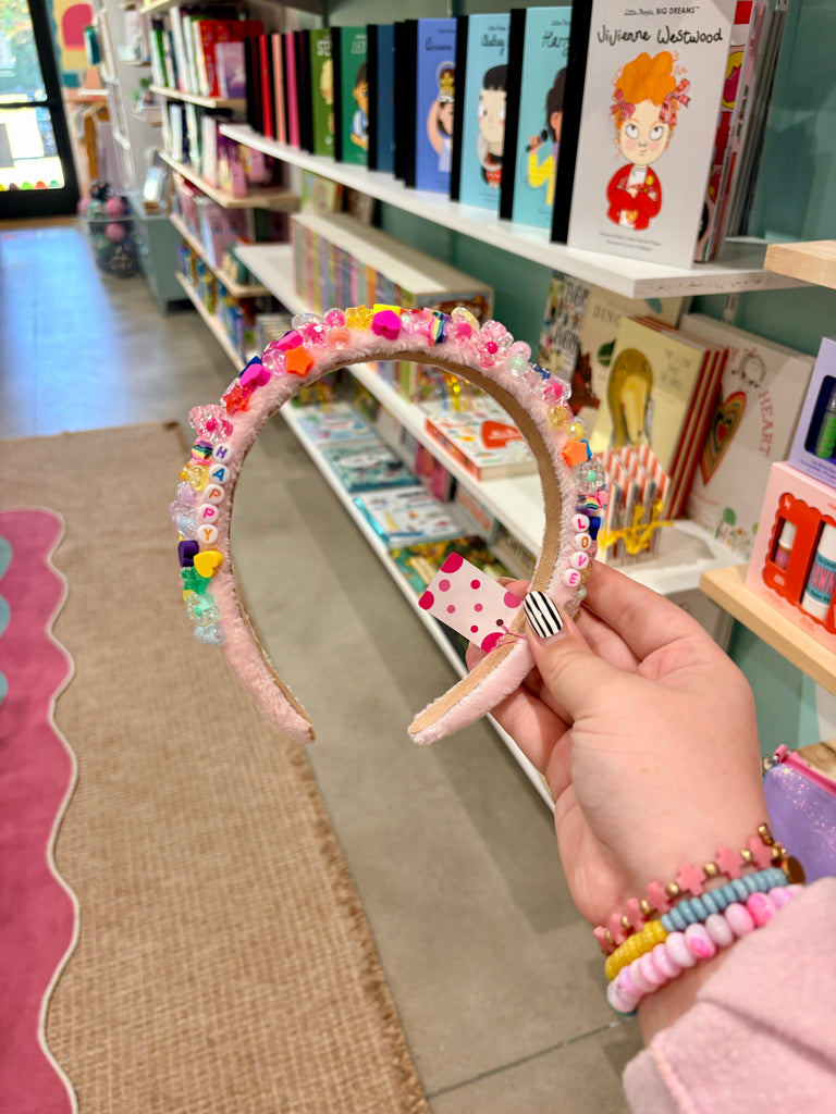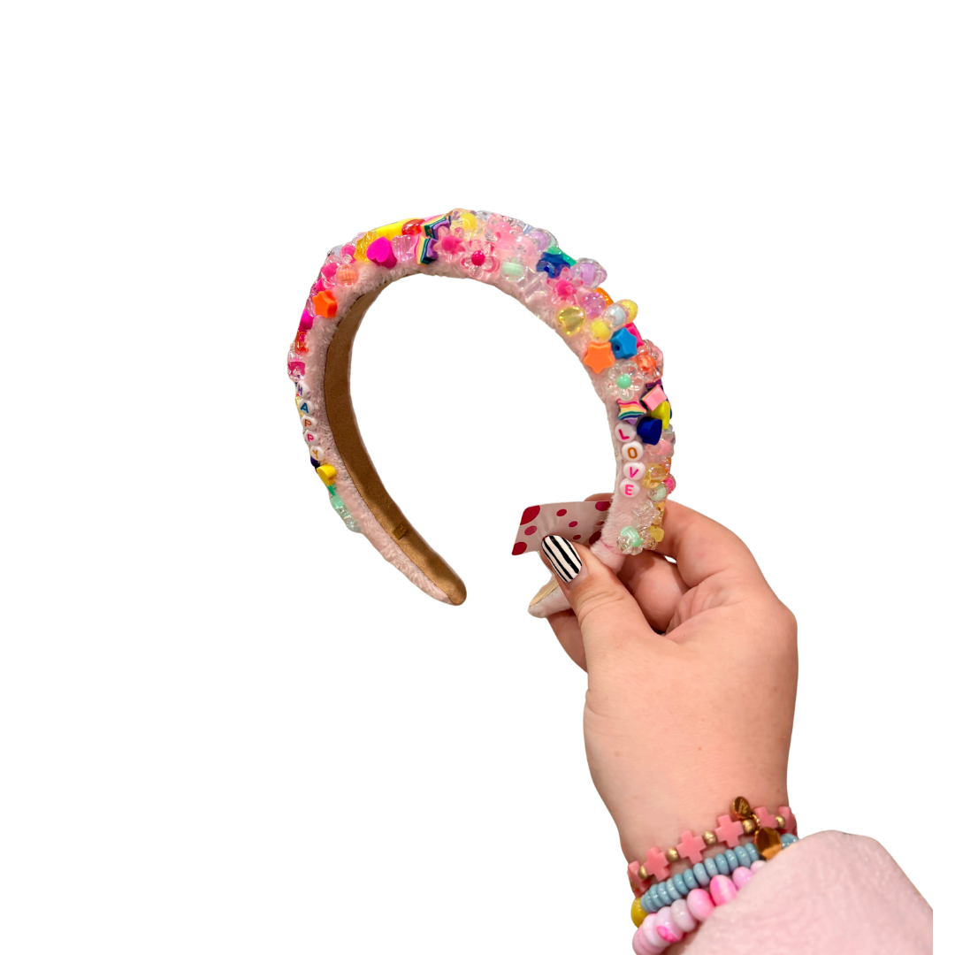 This Charm Headband brings the fun with a white base color and lively rainbow beads and appliques. It'll add a playful and attention-grabbing element to any outfit.
