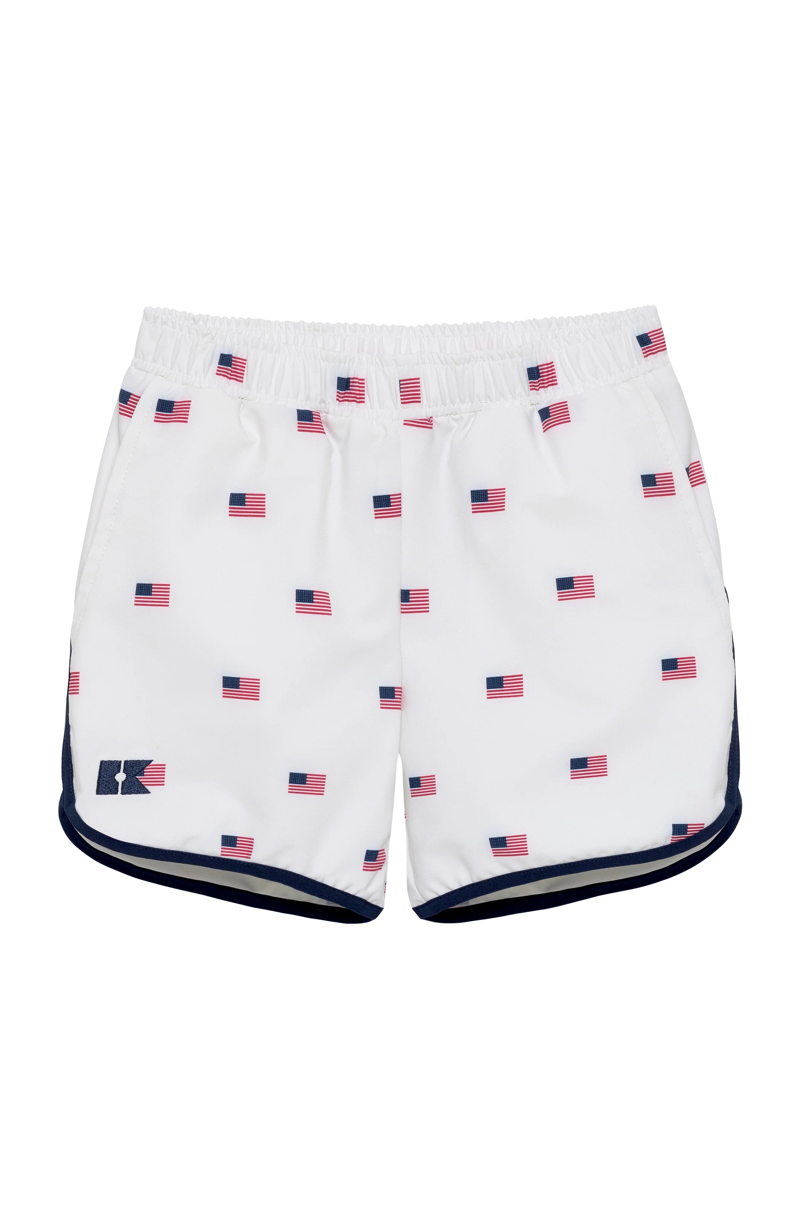 Designed for adventure, these Old Glory retro super shorts with white piping are your son's new best friend. Our super soft performance fabric stretches in every direction, while the built-in liner keeps odors at bay. With pockets perfect for collecting treasures, these might just be the best shorts he's ever worn!
