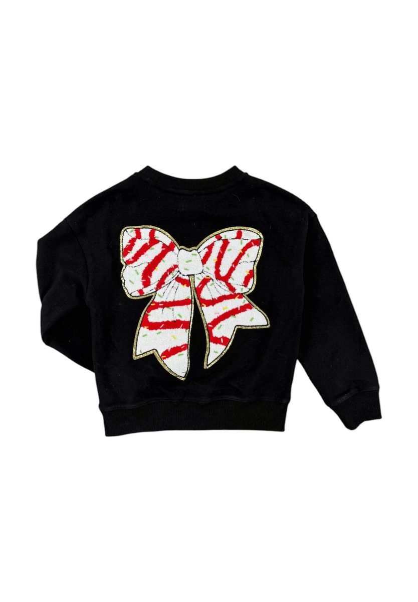 Get ready to sleigh the holiday season in the Lola & the Boys Christmas Bow Sweatshirt! This festive black sweatshirt features a bold candy cane-striped bow with shimmering gold accents on the back, adding a joyful pop of holiday spirit. Its classic crewneck fit, ribbed cuffs, and hem keep things cozy and comfy, while a tiny embroidered red heart on the front gives a sweet, playful touch. Perfect for spreading cheer with style and comfort!