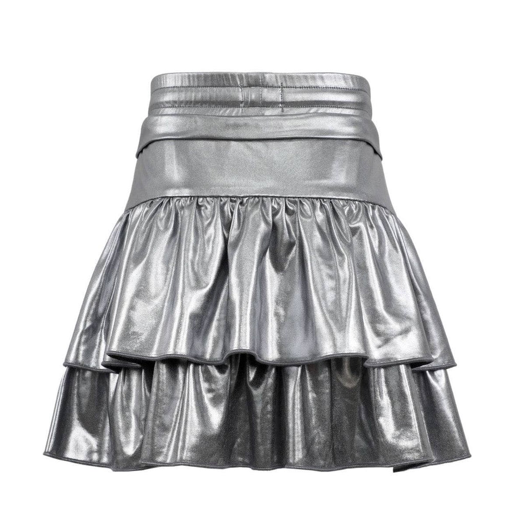 This shiny silver metallic skort features fun ruffle layers and a comfy elastic waistband with an adjustable drawstring. With built-in shorts, it's perfect for dancing, parties, and adding a bold pop of color.