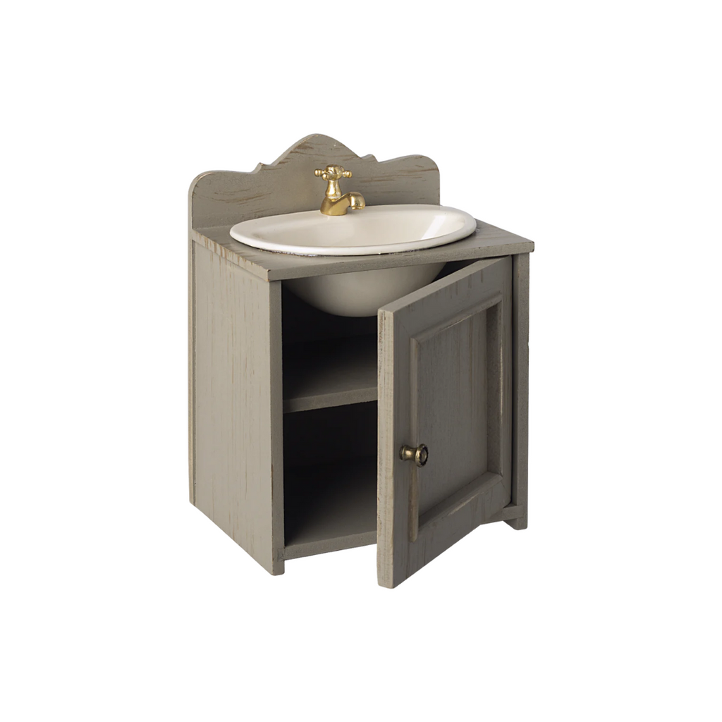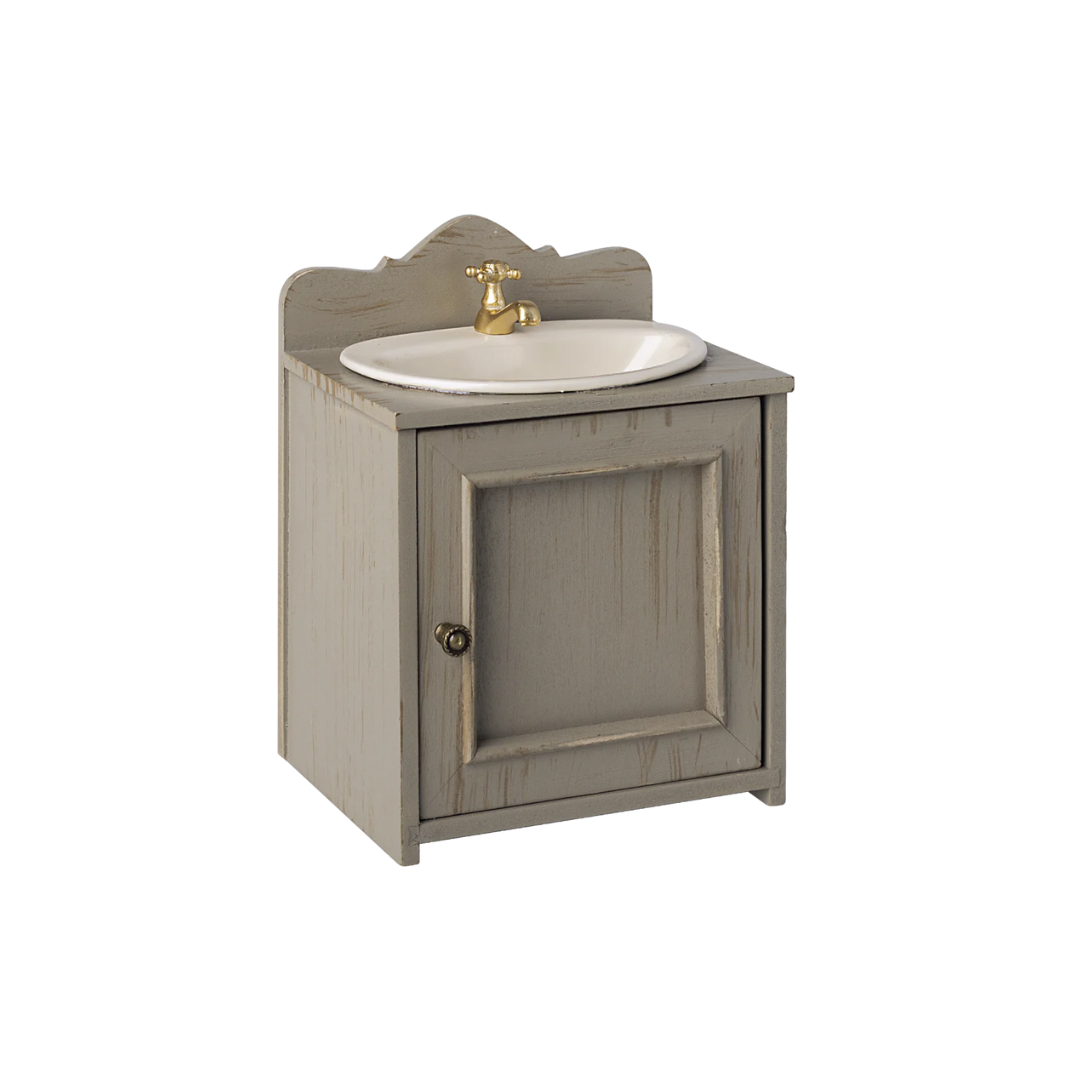 An adorable old-school sink in a metallic finish complete with a shiny faucet for your tiny mouse pals. Includes wooden shelves for storing your tiny trinkets.